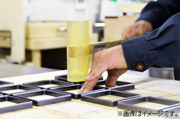 それは、基板に「ある部品」を複数設置し、成形品の輪郭に合わせて型自体が自在に遊動できる状態にする事によって、人間の目で調整をしなくても半自動的に打ち抜き位置を調整してくれるという装置です 。連続運転しても打ち抜き位置がずれにくい機構を考案し、大量のロス発生を防ぐことも可能にしました。( 技術の概要について詳しい説明を希望される場合は、お電話かお問い合わせフォームよりご連絡下さい。)